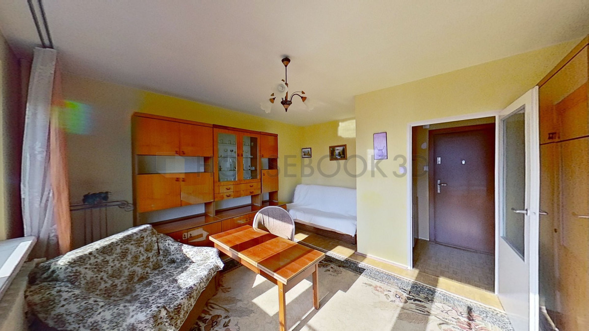 Układ mieszkania:Salon - wyposażony w rozkładaną kanapę, stolik z fotelami, dodatkowy rozkładany fotel, szafkę z telewizorem oraz pojemną szafę.