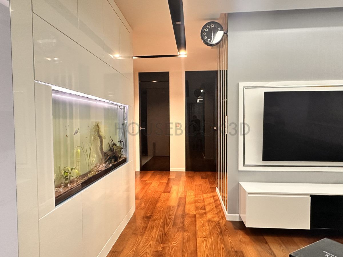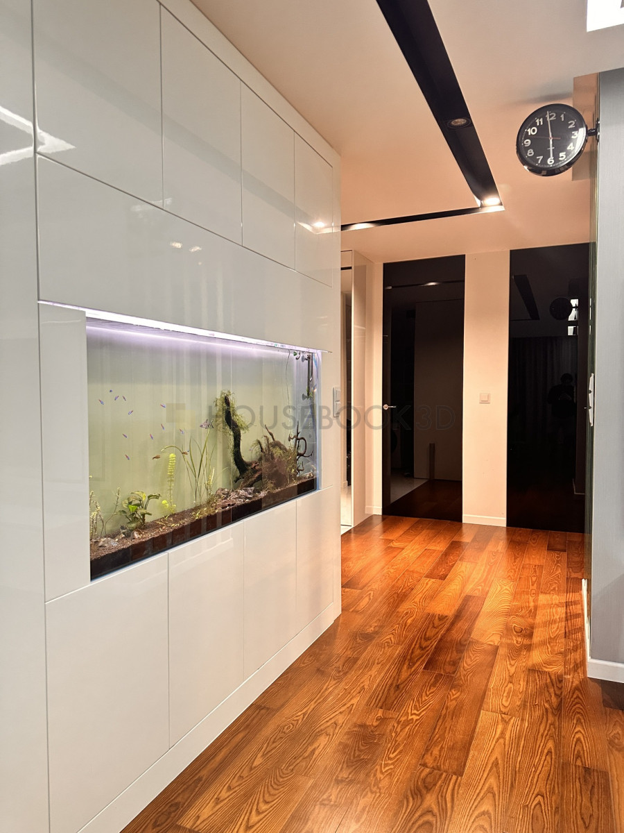 Mieszkanie zostało zaprojektowane z dbałością o każdy detal - dominują tu piękne, jasne meble na wymiar, które tworzą spójną, elegancką przestrzeń. Całość uzupełnia unikalny akcent w postaci akwarium z rybkami, które nadaje wnętrzu wyjątkowy, spokojny klimat.