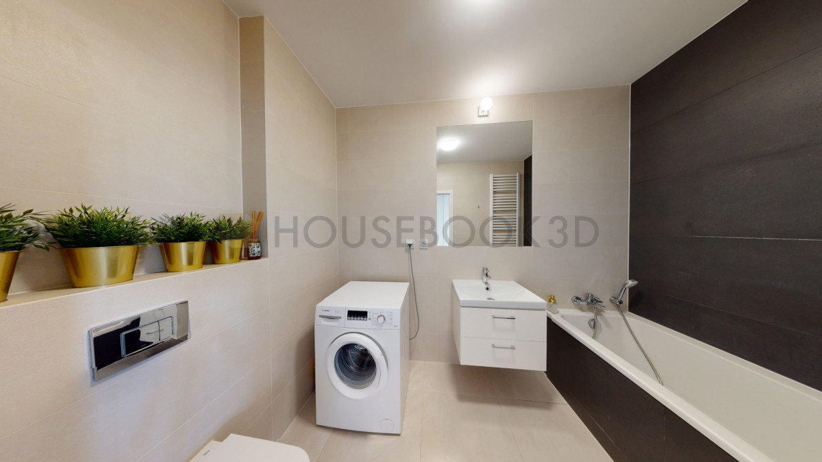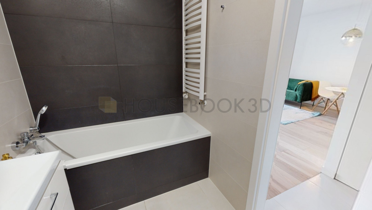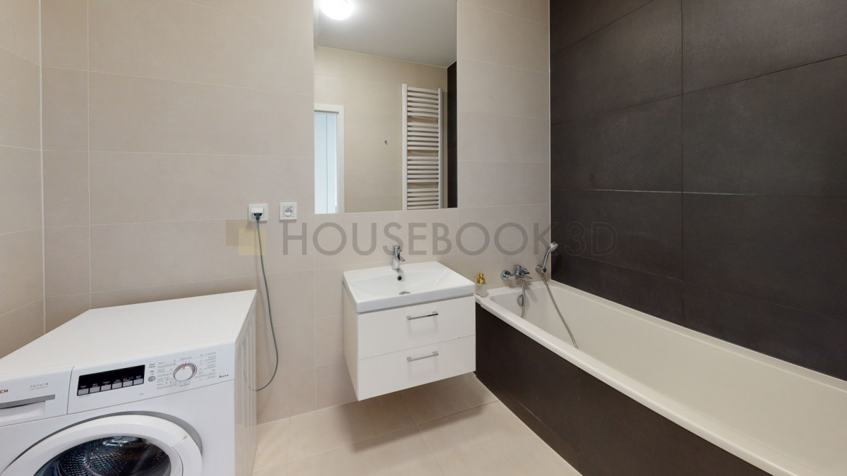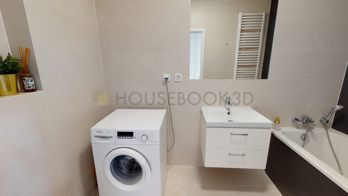 - Łazienka z wanną, pralką i dużym lustrem.