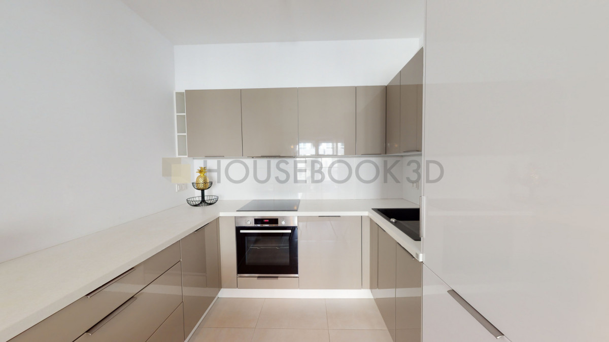 - Nowoczesny aneks kuchenny z pełnym AGD: płyta indukcyjna, piekarnik, okap, zmywarka, lodówka.