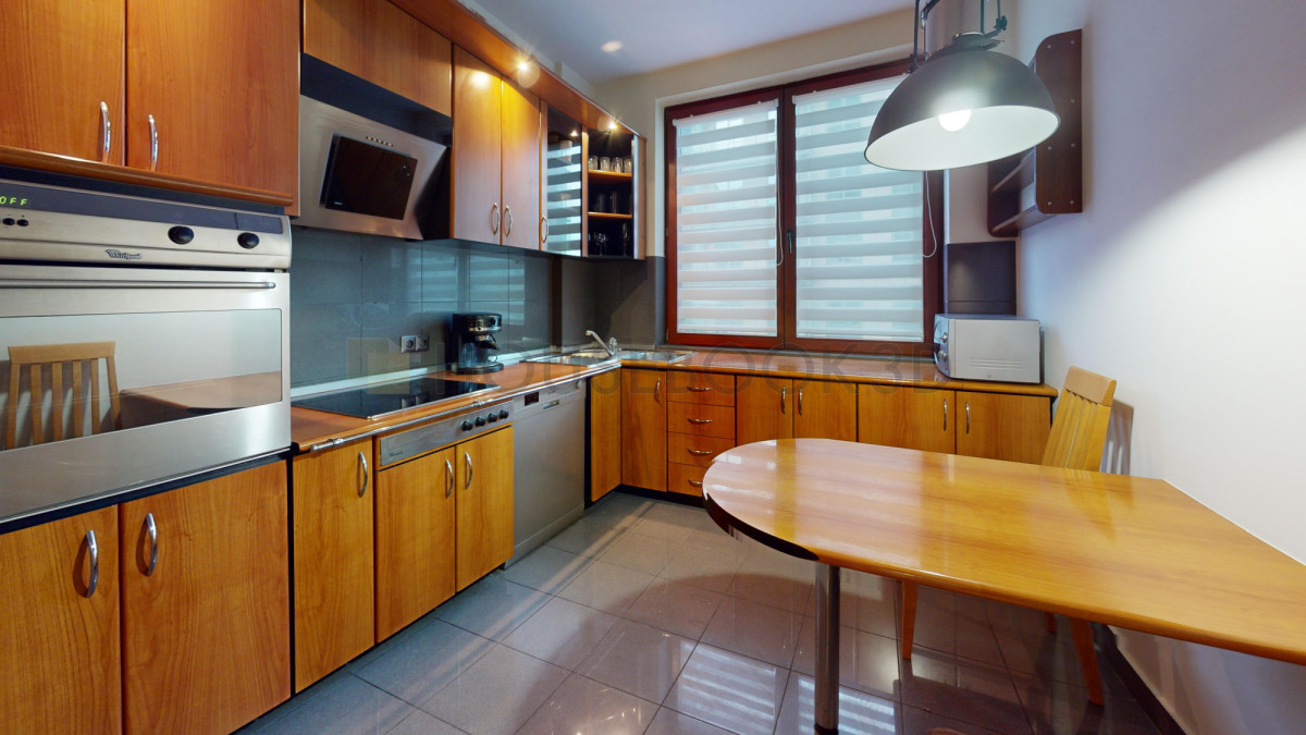 -Wyposażenie: kuchnia z meblami oraz sprzęt AGD (pralka, lodówka, kuchenka, piekarnik, zmywarka, mikrofalówka)