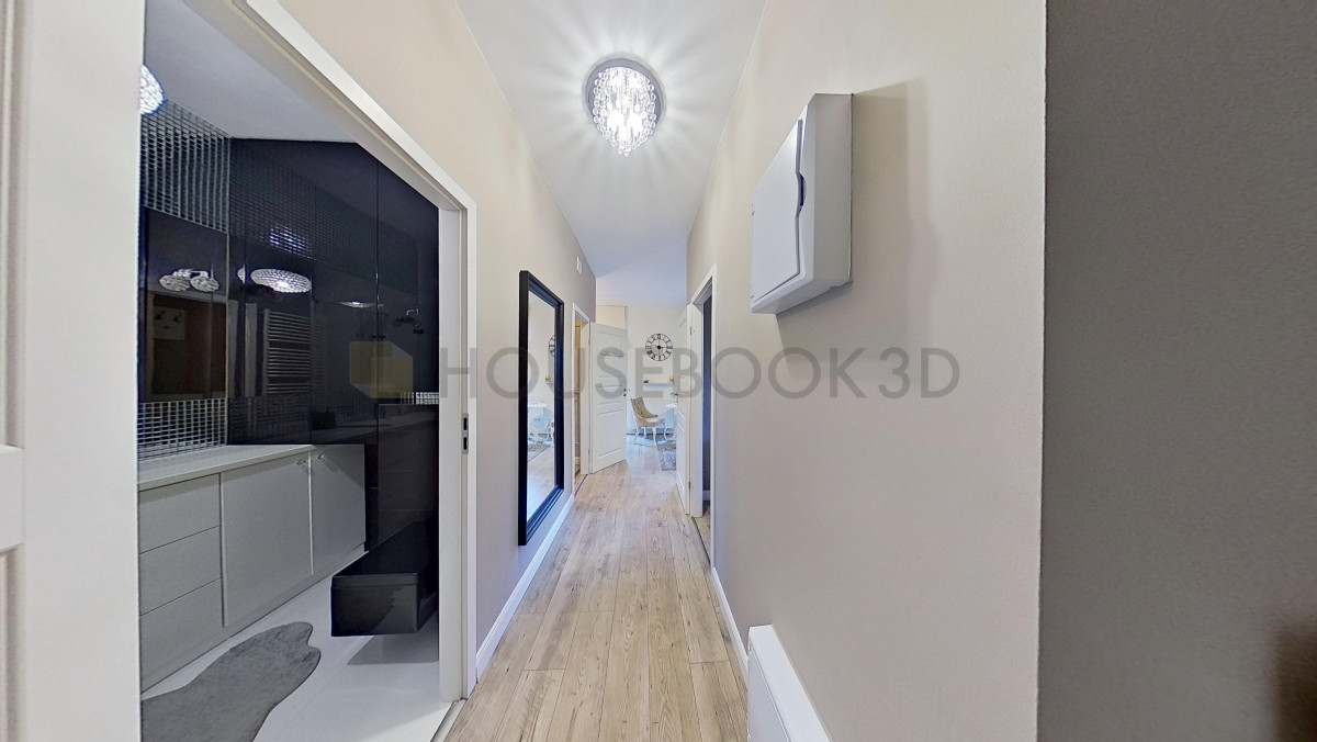 W korytarzu znajduje się wieszak na ubrania oraz szafka na obuwie, a co najważniejsze wejście do osobnej garderoby z dużą ilością półek, regałem oraz stelażem z wieszakami na ubrania.