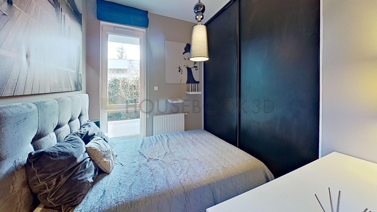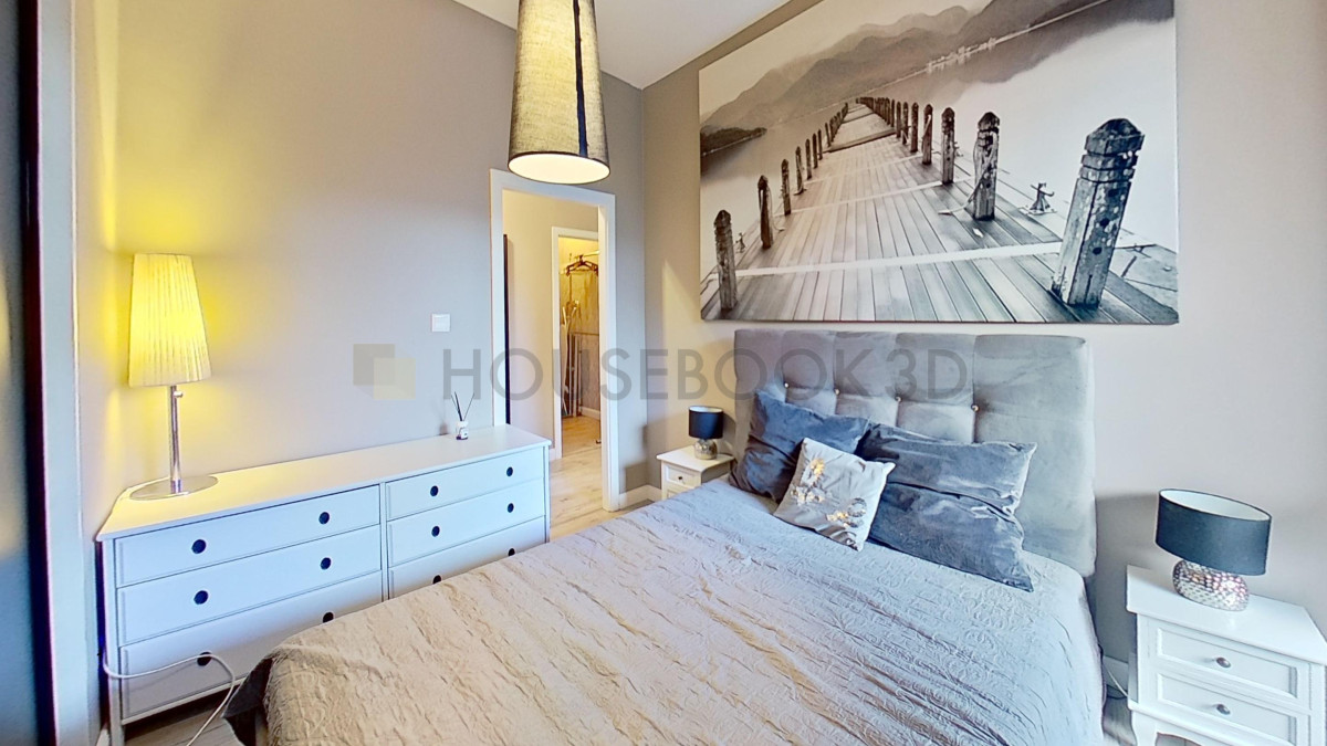 W sypialni znajduje się dwuosobowe łóżko (140 cm x 200 cm) z nowym materacem - posiada funkcję chowania pościeli wewnątrz (stelaż na podnośnikach pneumatycznych) oraz szafkami nocnymi, pojemną szafą i komodą. Do sypialni przylega mniejszy taras, na który można wyjść bezpośrednio z sypialni.