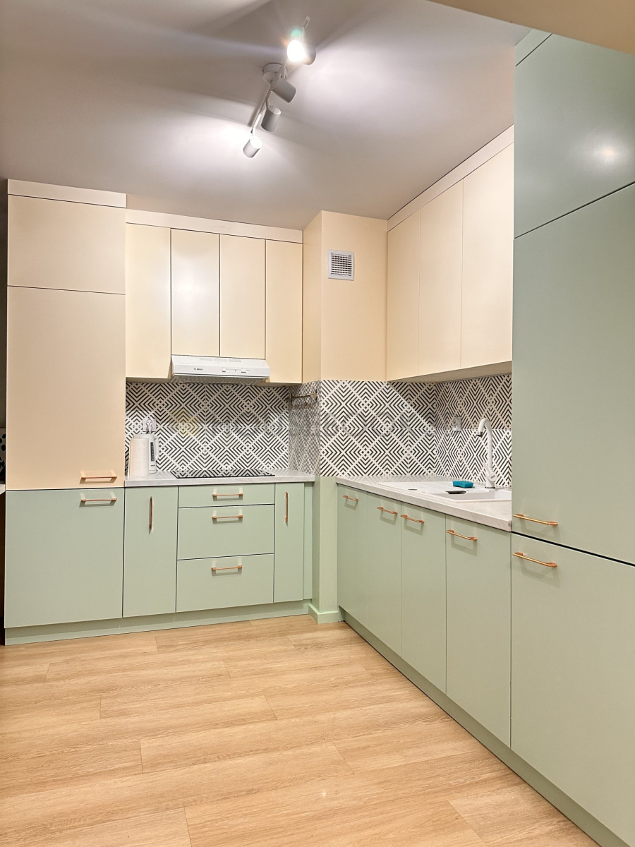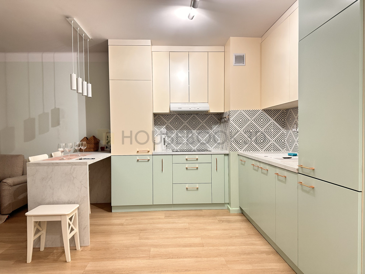 • Kuchnia: Nowoczesna zabudowa na wymiar, w pełni wyposażona w nowy sprzęt AGD (lodówka, płyta indukcyjna, piekarnik).