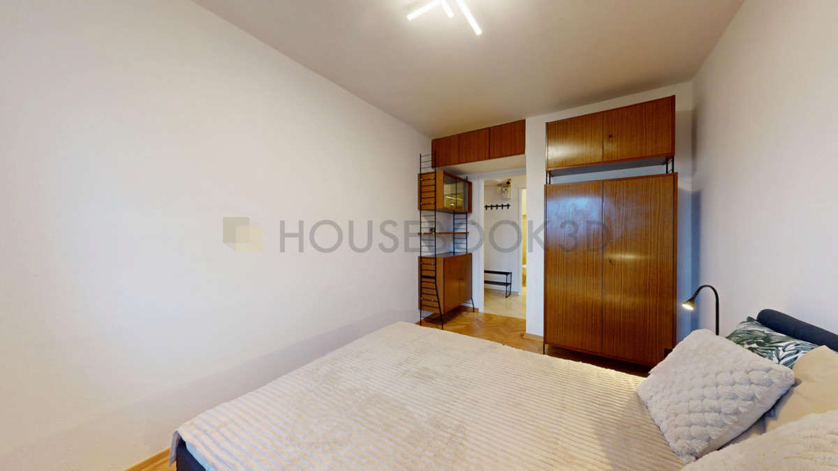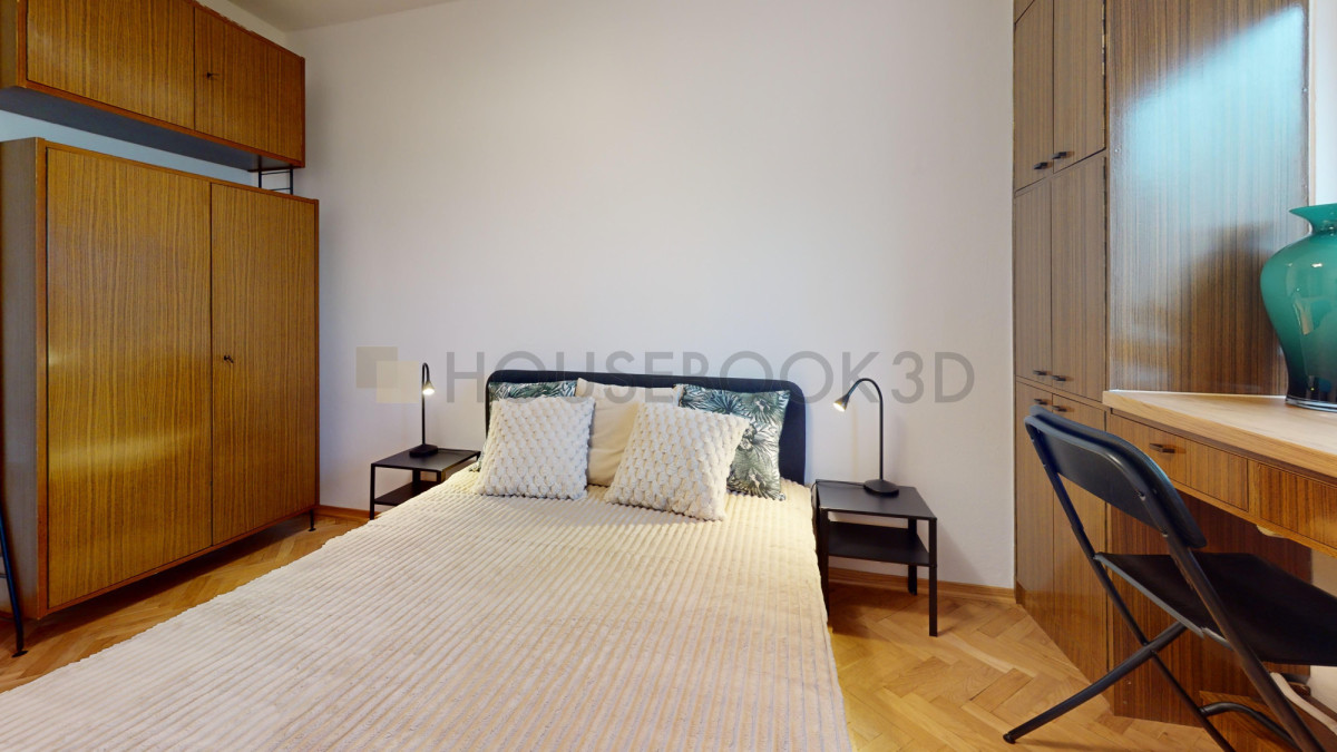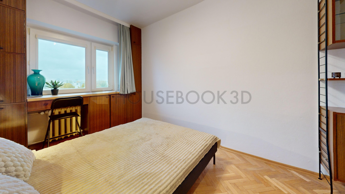 Sypialnia 1 (z balkonem): Duża, przestronna, z wyjściem na balkon. Wyposażenie: szafa, biurko, łóżko jednoosobowe oraz dwuosobowa kanapa rozkładana.